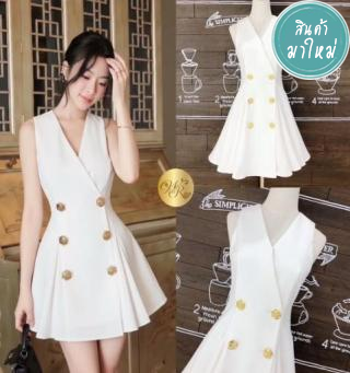 เดรสแขนกุด คอวีป้าย ติดกระดุมดอกไม้สีทอง ซิปหลัง