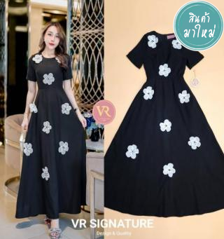 Dress ยาว แขนสั้น แต่งดอกไม้ 3d