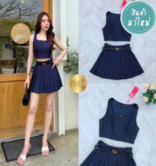 Set เสื้อแขนกุดกับกระโปรงสั้น ตัวเสื้อรูดซิปหน้า คอเหลี่ยม กระโปรงจีบรอบ ขอบเอวเย็บจีบเล็กๆ