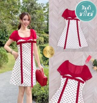 Dress เดรสแขนสั้น คอบัว อกเย็บโบว์และเย็บกระดุมเพชร