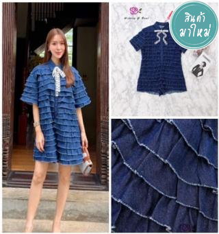 จั้มสูททรงปล่อย ขาสั้น แขนสั้น คอปก มีผ้าผูกโบว์สีขาว กระดุมหน้า