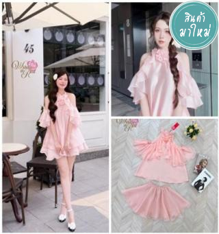 Set เสื้อทรงปล่อยเว้าไหล่กับกระโปรงสั้น ตัวเสื้ออกเย็บดอกไม้