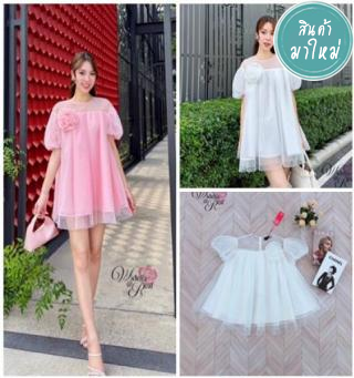 เดรสทรงปล่อย แขนพอง อกมีเข็มกัดดอกไม้ 1 ดอก เนื้อผ้ามุ้งลายจุด