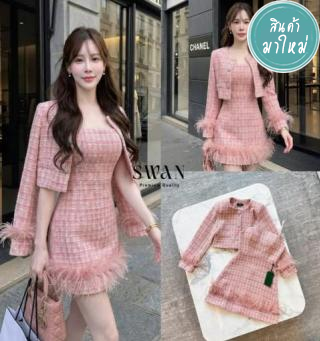เซทเสื้อคลุมแขนยาวผ้าทวิตชมพู แต่งกระดุมเพชรดอกไม้