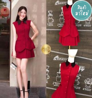 เซ็ตเสื้อคล้องคอผ้ามันคอถ่วงสีแดงมาคู่กับกระโปรงสอบตัวสั้นปักผีเสื้อสีทองอร่าม