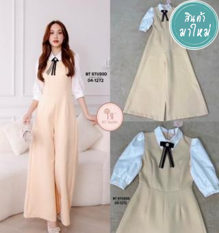 จั้มสูทขายาวดีเทลชุดยาวสีครีมเย็บติดคอปกมาพร้อมตัดแขนสีขาว