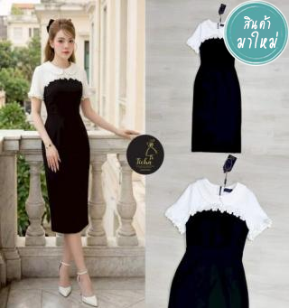 เดรสยาวคอบัวแขนสั้น ดีไซน์แต่งสีทูโทนขาวดำ