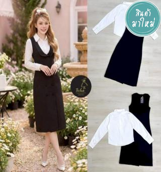Set 2 ชิ้น เดรสยาว+ เสื้อครอปแขนยาว เดรสยาวสีดำคอปกทรงวี ดีเทลกระดุมหน้ายาว (ใช้งานได้จริง)