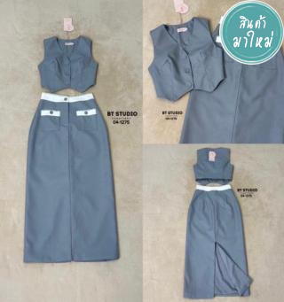 เซท 2 ชิ้น เสื้อเบเซอร์คอปกกกระดุมหน้าสวยมากแต่งกระเป๋ากุ้นขอบมาพร้อมกระโปรงยาวแต่งกระดุมหน้าติดกระเ