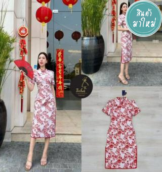 เดรสแขนกี่เพ้าแขนสั้นปักดอกไม้แดงผสมดิ้นทอง