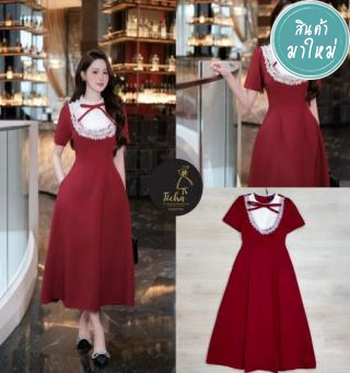 เดรสแขนสั้นสีแดง คอกลม ดีเทลแต่งช่วงคอสีขาว ระบายตามขอบ