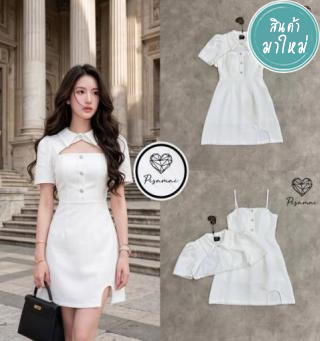 เดรสแขนกุดสีขาวแต่งดีเท็ลจีบย่นช่วงเอว