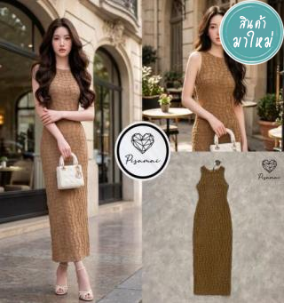 เดรสแขนกุดสีน้ำตาลตัวยาว งานทอนูนลายสี่เหลี่ยม ดีไซน์สวย