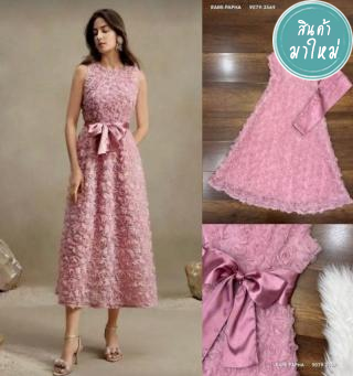 เดรสตัวยาว สวยหรูโดดเด่น เนื้อผ้า3Dทั้งตัวโทนสีชมพูสวยหวาน