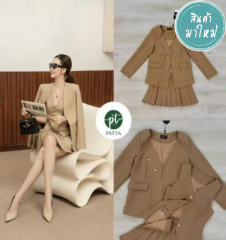 Set 4ชิ้น เสื้อสูท+เสื้อกั๊ก+กระโปรง+เข็มกลัด เสื้อคลุมสูทแขนยาวสีน้ำตาล