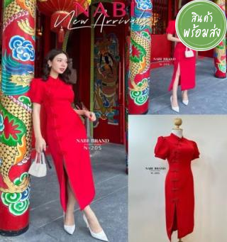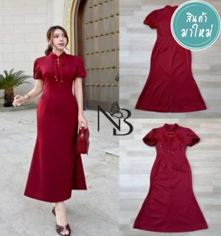 เดรสสีแดงแขนสั้น ดีไซน์แต่งด้วยกระดุมจีนไข่มุกแทบด้านหน้า มีผ่านด้านหน้าขอบเล็มด้วยกุ้นขอบจีน