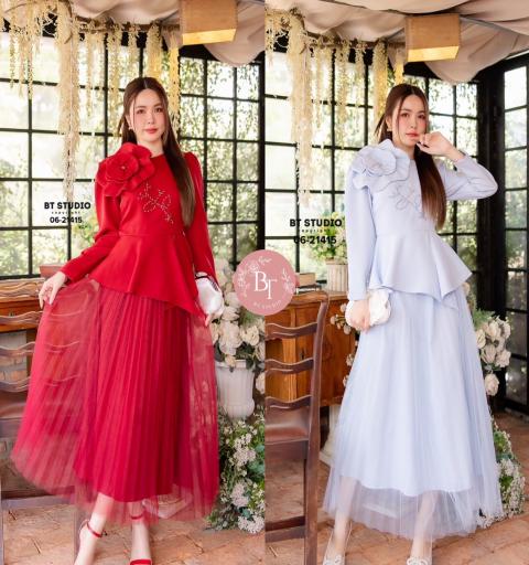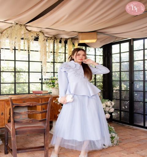 DETAIL : เซ็ท 2 ชิ้น เสื้อแขนยาวคอกลม แต่งดอกไม้ใหญ่อลังที่หัวไหล่ แต่งก้านปักด้วยลูกปัดและคริสตัล ปลายชายแต่งระบายไล่ระดับ มาพร้อมกระโปรงอัดพรีทมีซับใน งานสวยเนื้อผ้าดีมีซับใน