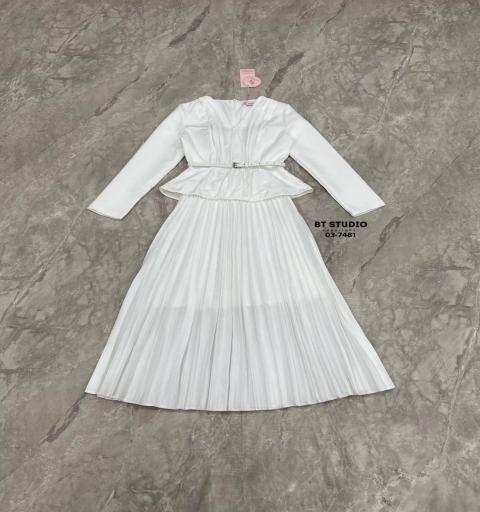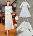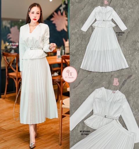 เซท 3 ชิ้น เสื้อแขนยาวคอวีตีเกล็ดตรงกลางปลายชายบานออกเล็กน้อย มาพร้อมกระโปรงเอวสูงอัดพรีท