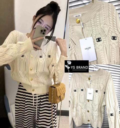 Brand: Celine Detail :เสื้อไหมพรมถักแขนยาว ผ้าไหมพรมยืดเนื้ออย่างดี ผ้าดีมากๆ นุ่ม ยืดได้เยอะ ผ้าดีทอละเอียด เย็บกระดุมCeline สีทองด้านหน้า เปัก Celine ช่วงอก สวยโดดเด่นสุดๆ มาพร้อมป้ายคอ Celine Tagครบ งานคุณภาพ ห้ามพลาด จัดเลยจ้า
