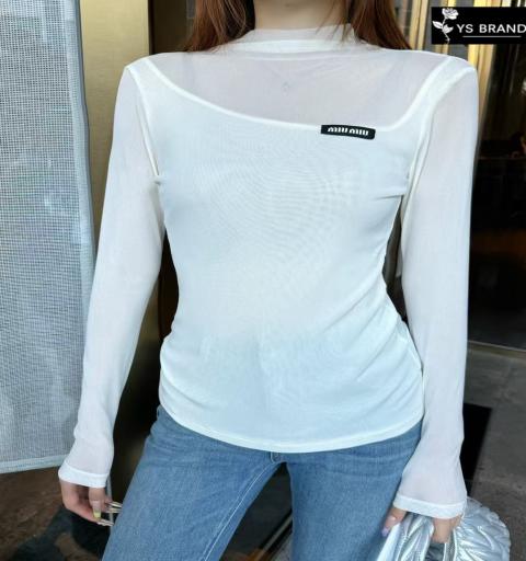 Brand: miu miu Detail :เสื้อซีทรูคอปีน ทรงแขนยาว ผ้ายืดซีทรูเนื้ออย่างดีผ้าดีมากๆ เย็บ miu miuช่วงอก สวยโดดเด่นมากๆคร่า มาพร้อมป้ายคอ miu miu Tagครบสวยมาก งานคุณภาพ ห้ามพลาด จัดเลยจ้า