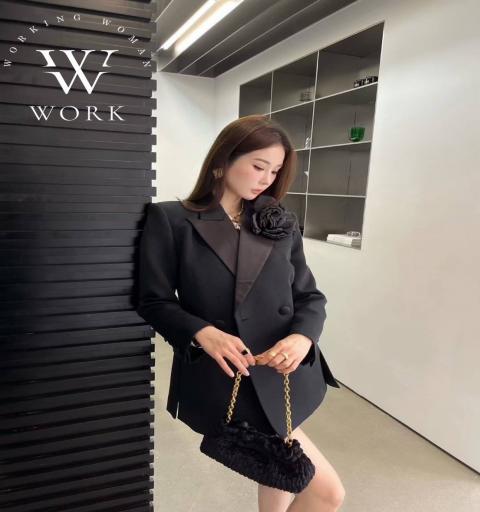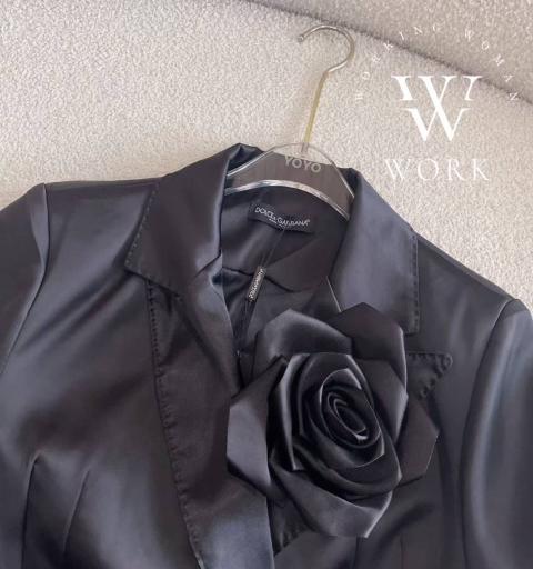 เบลเซอร์ทรงทักซิโด้สุดหรู ที่มาพร้อมซิลูเอตต์โฉบเฉี่ยวเฉพาะตัว เพิ่มกลิ่นอายความคลาสสิกแต่ยังแฝงความทันสมัยได้อย่างลงตัว จุดเด่นอยู่ที่ดอกกุหลาบผ้าซาตินขนาดใหญ่ที่ประดับบนปกคอ เพิ่มความโดดเด่นให้ลุคทำงานหรือดินเนอร์ยามค่ำคืนดูแพงแบบ effortless ตัวเบลเซอร์เป็นงานตัดเย็บเนี้ยบ จากผ้าทอเนื้อซาตินด้านนอกเล่นแสงเบาๆ ทำให้ชุดดูมีมิติแบบไม่ต้องพยายาม คัตติ้งเข้ารูปช่วงเอวเล็กน้อย ช่วยเก็บสัดส่วนให้ดูเพรียว มาพร้อมดีเทลกระดุมหน้าคู่เรียบหรู ใส่คู่กับกางเกงขาสั้นหรือกระโปรงทรงดินสอก็ได้ลุค Working Woman ที่มีทั้งความมั่นใจและสไตล์ในตัวเดียว