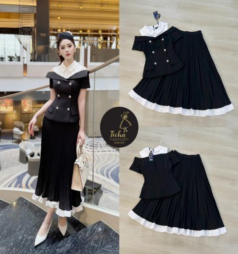 👗👗Detail : Set 2 ชิ้น เสื้อเบเซอร์แขนสั้นทูโทน คอปก ดีเทลแต่งเว้าไหล่ ช่วงอกเสริมฟองน้ำ ด้านหน้าแต่งกระดุมเพชรสลับมุกดอกไม้สองแถว (ซิปหลัง) แมทซ์กับกระโปรงยาวอัดพีท พริ้วๆ ปลายชายแต่งระบายขาว มีชับใน ซิปข้าง ใส่ออกมา ทรงสวย ดูดี luxury สุดๆ ห้ามพลาดนะคะ