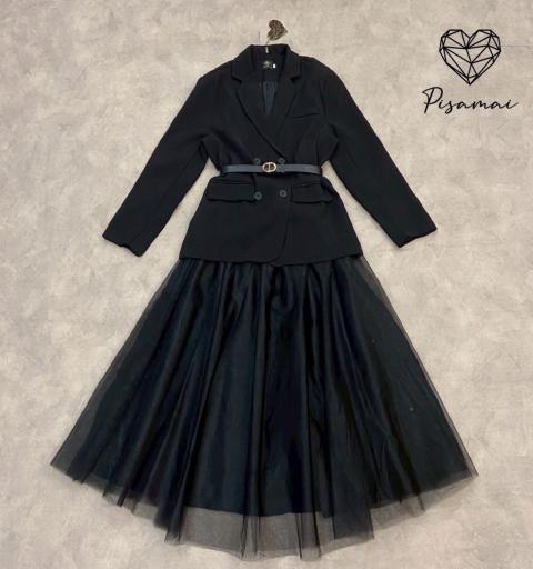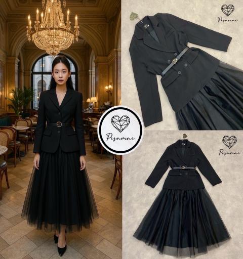 เซ็ตเสื้อสูทเบเซอร์ oversize ทรงเป๊ะ มาคู่กับกระโปรงฟูตังยาวสีดำ