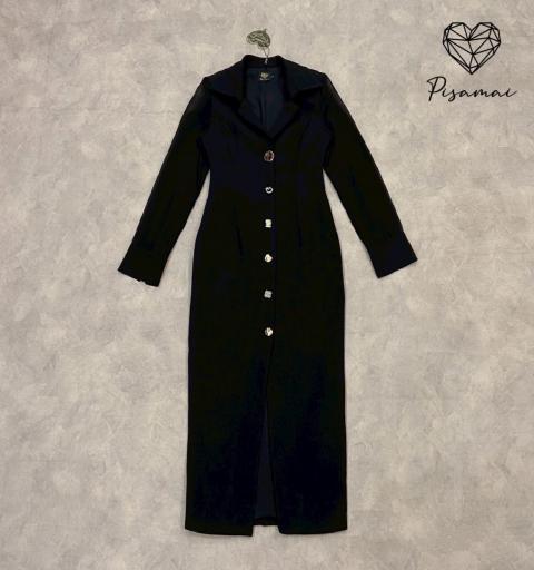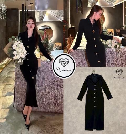 เดรสคอปกเชิ้ตตัวยาวสีดำแต่งกระดุมหน้าเรียง