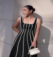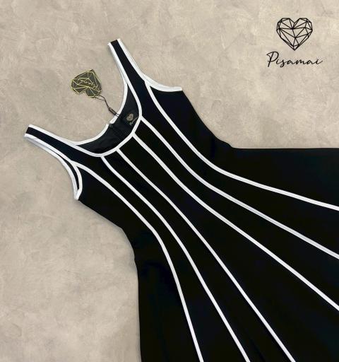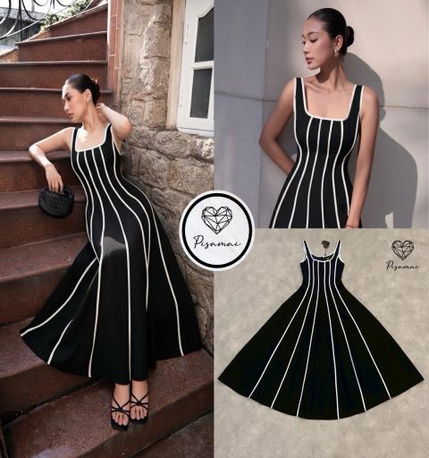 เดรสแขนกุดตัวยาวสีดำทรงบานแต่งลายเส้นสีขาวนูน