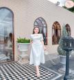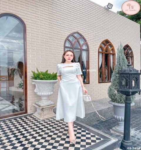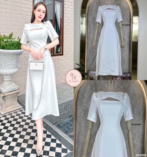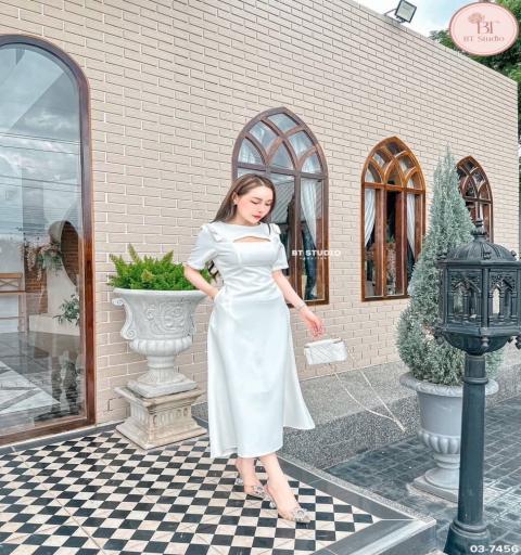 เดรสยาวแขนสี่ส่วนช่วงไหล่แต่งโบทั้งสองข้างเว้าสามเหลี่ยมช่วงเนินอกเล็กน้อย