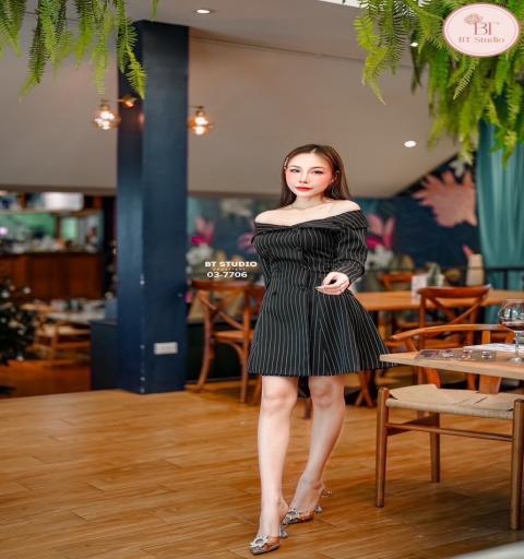 เดรสสั้นดีไซส์ปาดไหล่ปิดต้นแขนทั้งสองข้างแขนยาวแต่งปกช่วงปาดไหล่ ก