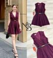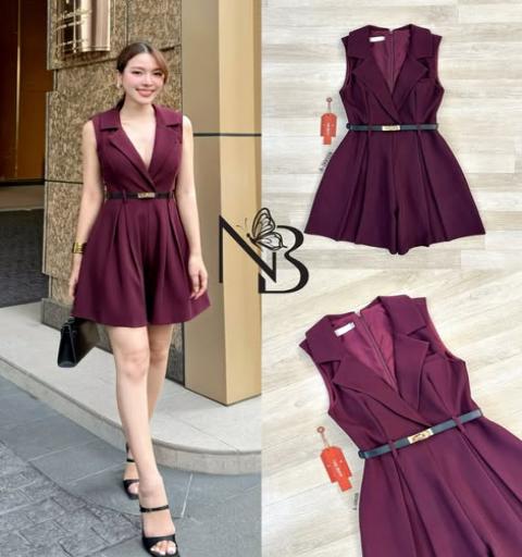 จั้มสั้นสีแดงไวน์ ดีไซน์คอวีทรงปล่อย แต่งกระเป๋าช่วงอกและเย็บจีบช่วงขา