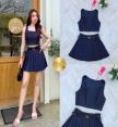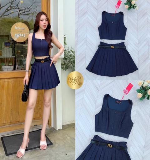 Set เสื้อแขนกุดกับกระโปรงสั้น ตัวเสื้อรูดซิปหน้า คอเหลี่ยม กระโปรงจีบรอบ ขอบเอวเย็บจีบเล็กๆ