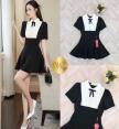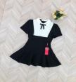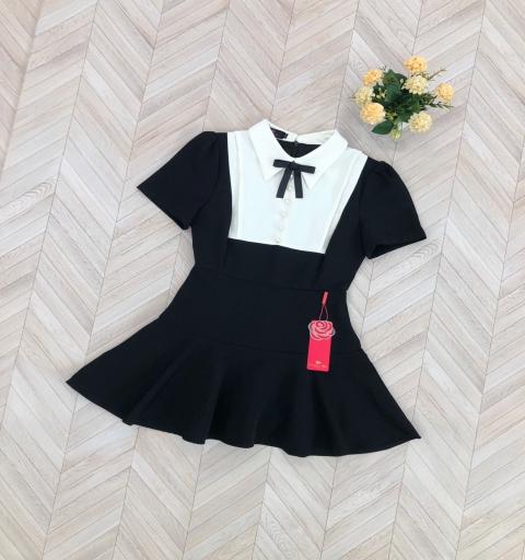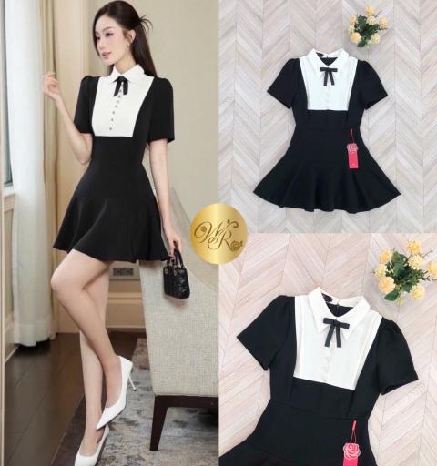ขนสั้น คอปก โบว์ดำ อกไข่มุก ซิปหลัง เนื้อผ้าเรียบ สีพื้น