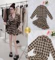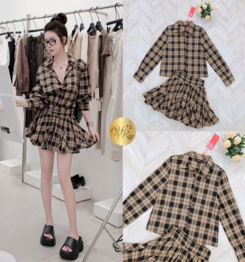 Set เสื้อเชิ้ตแขนยาวกับกระโปรงสั้น เนื้อผ้าลายสก็อตสีน้ำตาลดำ