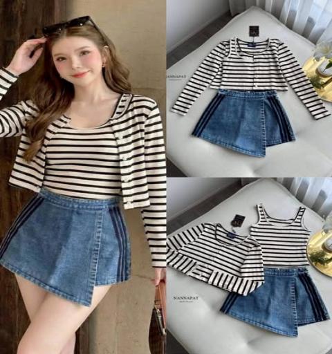 T AG :: NANNAPAT (NP)  CONCEPT :: งานต้อง Premium กำไรน้อยไม่ว่า คุณภาพ เละ เนื้อผ้าต้องดี  ♡DETAILS♡  คุ้มตะโกน! จ่าย 1 ได้ถึง 3 ชิ้น แมทช์ยังไงก็ปัง! สไตล์ Casual Chic ที่ดูใส่ง่ายแต่มีดีเทล ไม่ต้องคิดเยอะให้ปวดหัว กับเซ็ตเสื้อกล้ามลายขวาง + เสื้อคลุมเข้าชุด + กระโปรงยีนส์ดีเทลเก๋! ผ้านุ่มใส่สบาย จะแยกชิ้นไปแมทช์กับตัวอื่นก็ได้ หรือใส่ครบเซ็ตก็คอมพลีทลุคสุดๆ กระโปรงทรงนี้บอกเลยว่าใส่แล้วขาดูเรียวยาวมากกก สาวไซส์ไหนก็รอด!  COLOR 》》》  NP. STANDARD SIZE  (โดยประมาณนะค่ะ) S }} Bust 32-33"/ Waist 26-27"/ Hip 36-37" M }} Bust 34-35"/ Waist 28-29"/ Hip 38-39" L }} Bust 36-37"/ Waist 30-31"/ Hip 40-41" XL }} Bust 38-39"/ Waist 32-33"/ Hip 42-43" Langth }} = Shirt 18",16"/ Pants skirt 14"  Care Dry clean only ควรซักแห้ง หรือ ซักมือ และเลี่ยงน้ำยาซักผ้า เพื่อเป็นการถนอมผ้า และ ลดความเสียหายวัสดุตกแต่ง นะคะ  ตรวจสอบสินค้าทุกครั้งก่อนออกจากร้านนะคะ จะได้ไม่เสียเวลาคะ  เปลี่ยนคืนสินค้ามีตำหนิต้องภายใน 10 วันนะคะ ป้ายไม่ตัด ห่อเดิมนะคะ  ได้รับสินค้าแล้ว ถ่ายวีดีโอตอนแกะเช็คสินค้าทุกครั้ง เผื่อมีปัญหา จะได้ใว้ยืนยันเพื่อเปลี่ยนคืน |