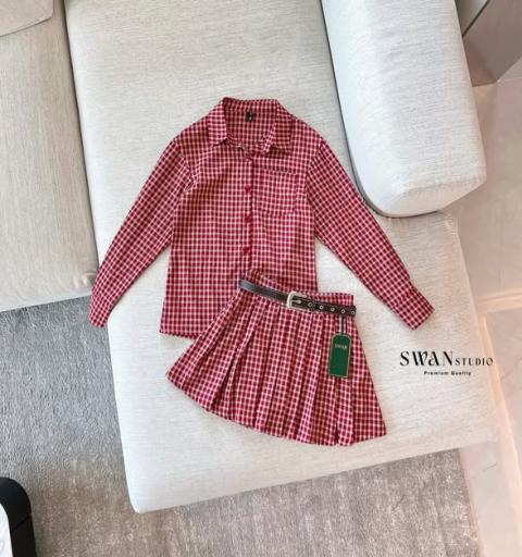 Set 3 ชิ้น เสื้อเชิ้ต + กระโปรง + เข็มขัด ดีไซน์ผ้าลายตารางโทนแดงสุดคลาสสิก