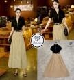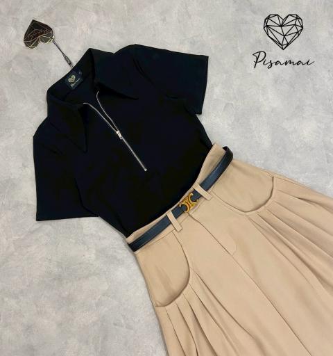 เซ็ตเสื้อผ้าร่องคอปกแต่งชิป มาคู่กับกระโปรงตีเกร็ดช่วงกระเป๋าสีน้ำตาล