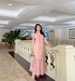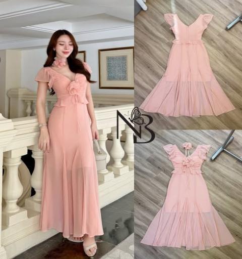 Maxi dress ผ้าชีฟองแขนระบาย มีซับในและฟองน้ำ งานซิบหลัง ชุดทรงแขนระบายและแต่งระบายใต้อก