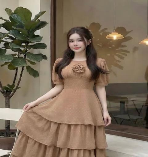 ผ้าชีฟอง คอกลมแขนตุ๊กตา เอวเข้ารูป มีเข็มกลัดดอกไม้ กระโปรงยาวพริ้วชั้นๆ ผ้ามี Texture สวยปังมาก ซิปด้านหลัง