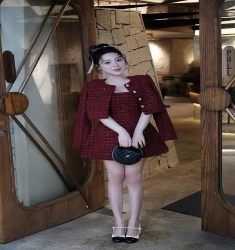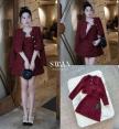 Set 2 ชิ้น เสื้อคลุม + เดรส โทนแดงไวน์เนื้อผ้าทวีดผสมกลิตเตอร์เล็ก ๆ