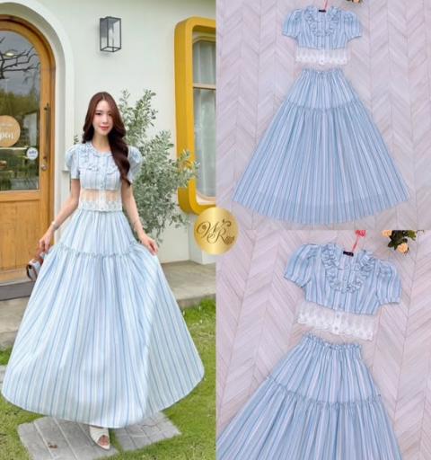 Set เสื้อแขนสั้นกับกระโปรงยาว คอเสื้อเย็บแต่งขอบระบายเล็กๆ
