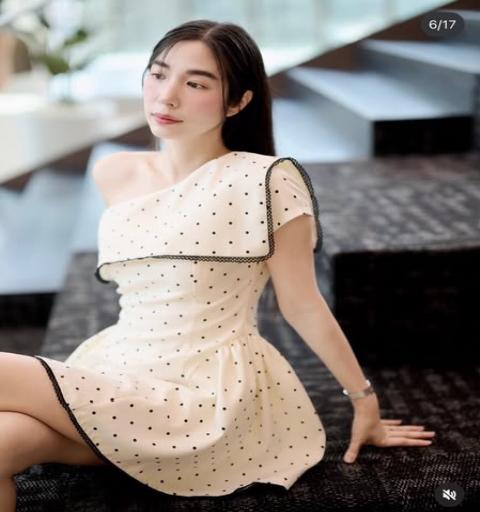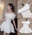 เดรสสุดน่ารักดีไซน์คอปาดแบบเฉียง + ลายจุดขาวดำสุดคลาสสิค ใส่ง่าย ใส่แล้วดูมีลุคชิคๆ หวานๆ ไม่ซ้ำใคร