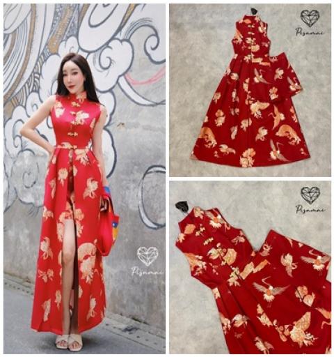 เดรสกี่เพ้าแขนกุดตัวยาวสีแดงพิมลายนกสีทอง