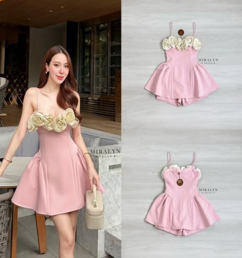 มินิเดรสสายเดี่ยวสีชมพูแต่งดอกไม้สีครีมช่วงอกแบบสวยน่ารัก