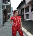 เซ็ทเสื้อคอจีน แต่งกุ๊นขาวสลับแดง แต่งกระดุมแบบกุ๊นจีนเก๋ไม่เบา