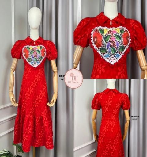 เเดรสยาวแต่งแขนสั้นพองๆ คอปกตรงกลางปักลายดอกไม้