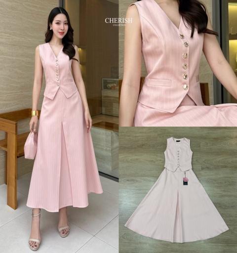 ชุดเซ็ทสุดหรู ดูแพง ตัวเสื้อลายทางตกแต่งกระดุมสุดคลาสสิค