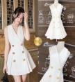 เดรสแขนกุด คอวีป้าย ติดกระดุมดอกไม้สีทอง ซิปหลัง