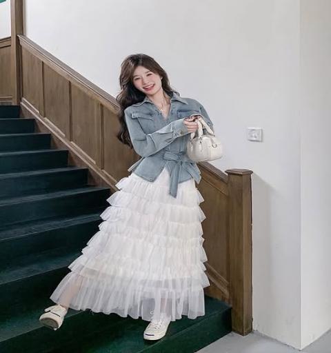 เซ็ตเสื้อยีนส์ฟอกคอปกแขนยาว มาคู่กับกระโปรงสีครีมชั้นระบาย พร้อมเชือกเข้าเซ็ต